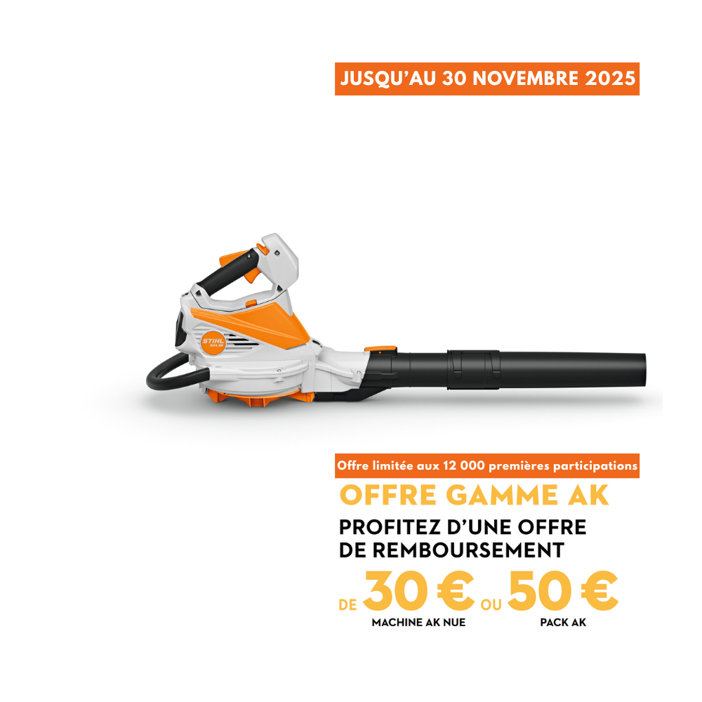 Offre valable pour tout achat réalisé entre le 1er septembre 2025 au 30 novembre 2025 d’une machine nue (produit seul) ou d’un Pack ( un produit + une batterie + un chargeur ou un produit + un set de démarrage) de la GAMME AK SYSTEM.
