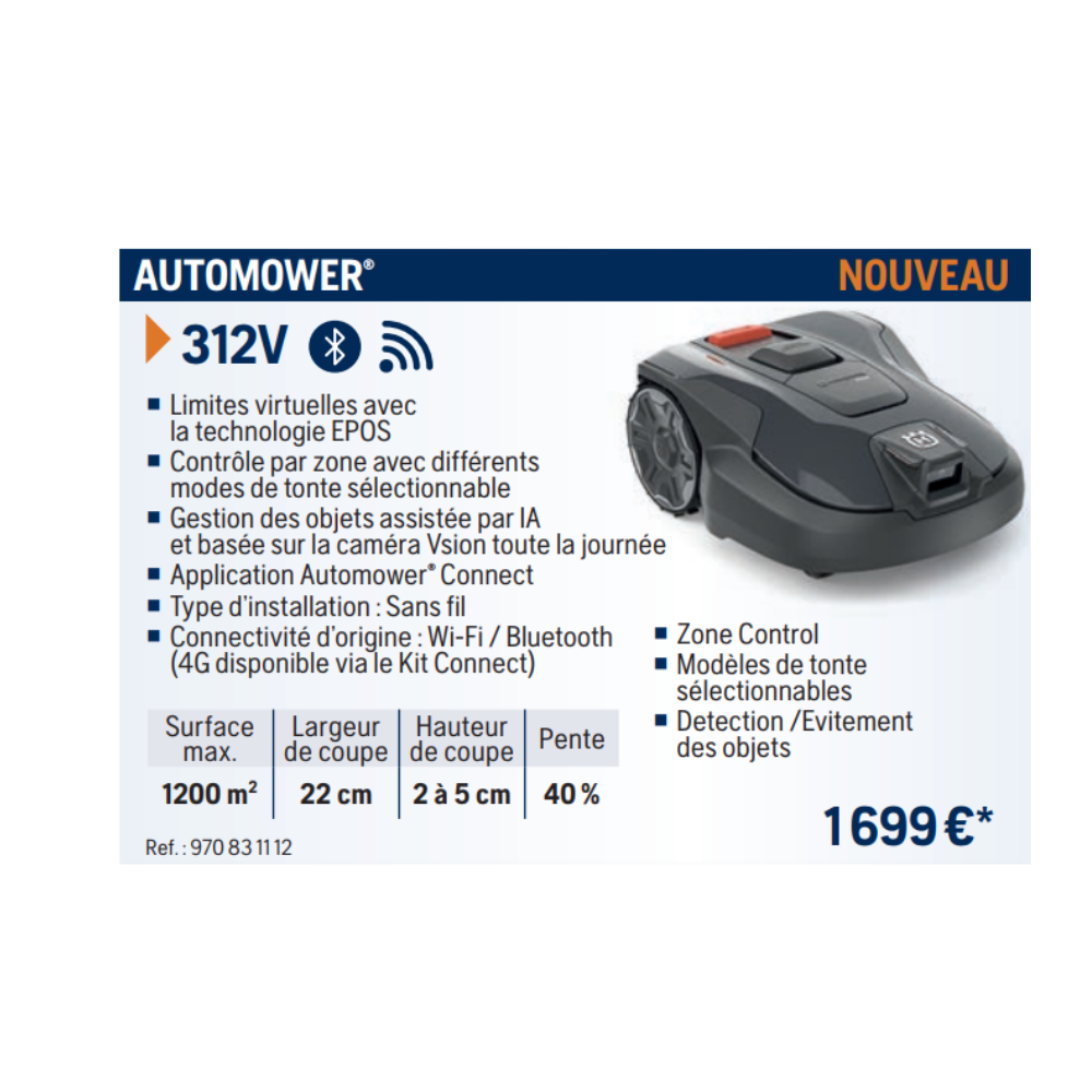 L'Automower® Husqvarna 312V est un robot tondeuse sans câble conçu pour les pelouses allant jusqu'à 1 200 m², pour un entretien sans effort et extrêmement fiable. L'installation sans câble nécessite une couverture Wi-Fi sur toute la surface de la pelouse, et grâce à notre technologie satellite incluse, l'installation virtuelle est flexible et robuste.