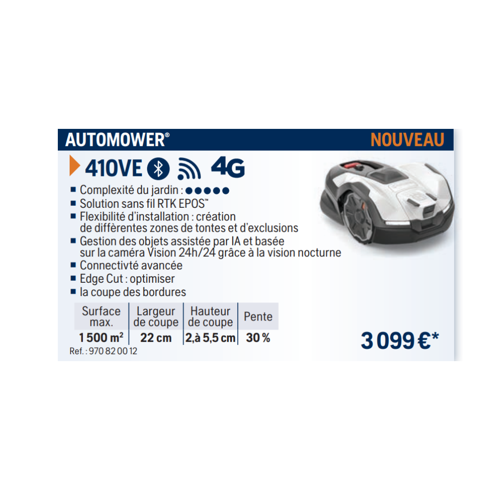Automower® Husqvarna 410VE NERA : un robot tondeuse sans câble doté de fonctions innovantes et conçu pour offrir des résultats impeccables sur les pelouses allant jusqu'à 1500 m². Grâce à la fonction EdgeCut, les bordures de la pelouse restent nettes, tout en vous faisant gagner du temps et en réduisant les efforts de tonte. Grâce aux périphéries virtuelles activées par notre technologie satellite incluse, l'installation devient flexible et robuste.