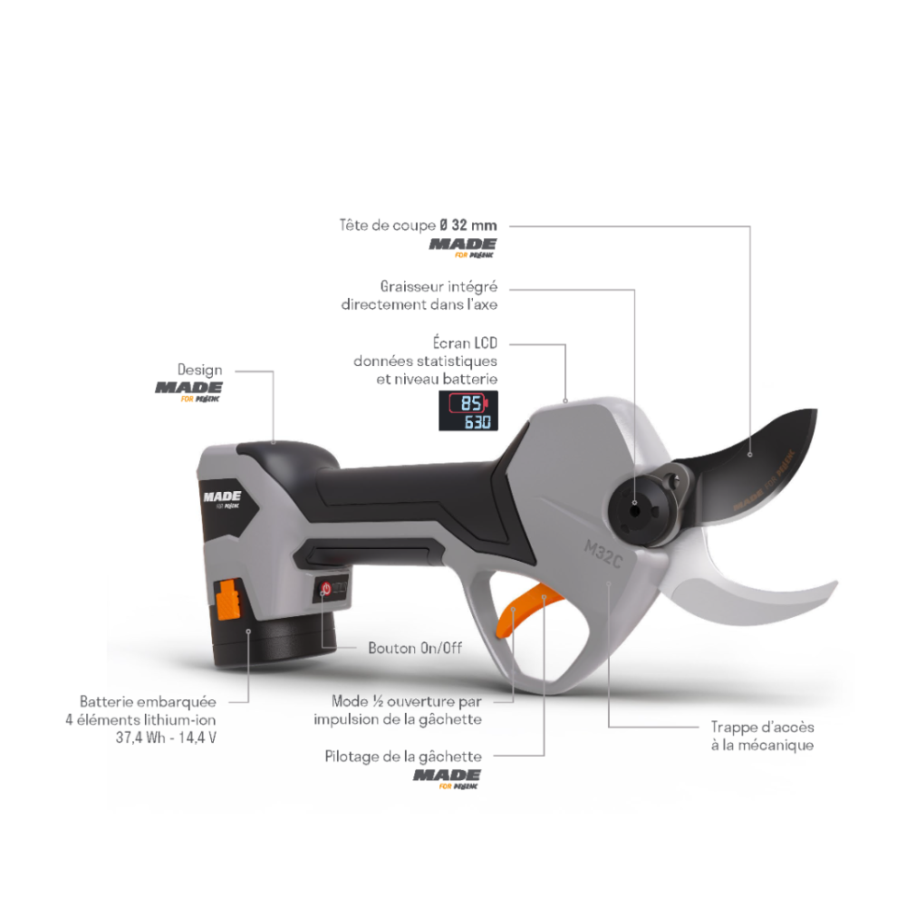 Pack incluant 1 sécateur M32C, 2 batteries M32C et 1 chargeur. Ce nouveau modèle de sécateur M32C vous accompagnera pour effectuer vos travaux de viticulture, d‘arboriculture ou d‘entretien des espaces verts. Les équipes R&D PELLENC sont intervenues pour optimiser le design, la tête de coupe et le fonctionnement de la gâchette afin de rendre ce modèle plus ergonomique. Associé à ses batteries embarquées au lithium-ion, cet outil vous permet une autonomie jusqu‘à une journée de travail.