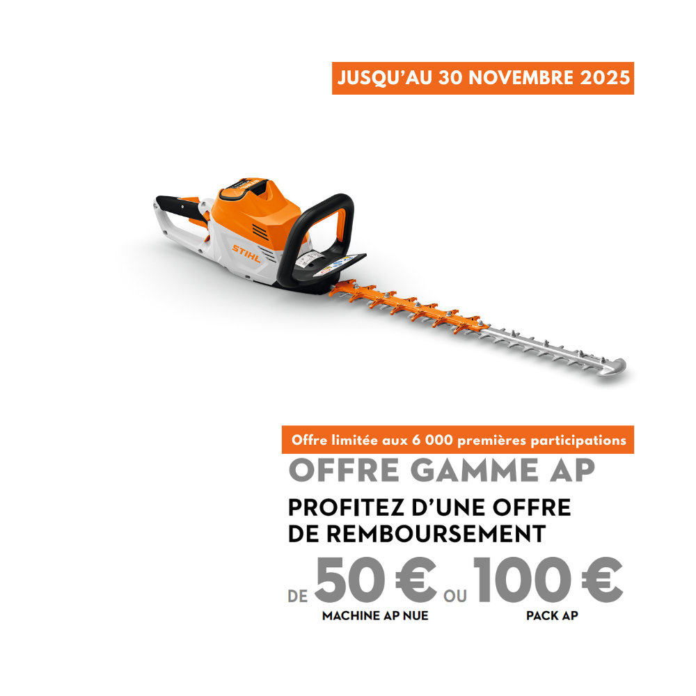 Sous réserve des stocks disponibles. Cette offre est accessible dans la limite des 6 000 premières participations reçues par STIHL. Modalités complètes et participation sur : https://www.stihl-promo.fr/