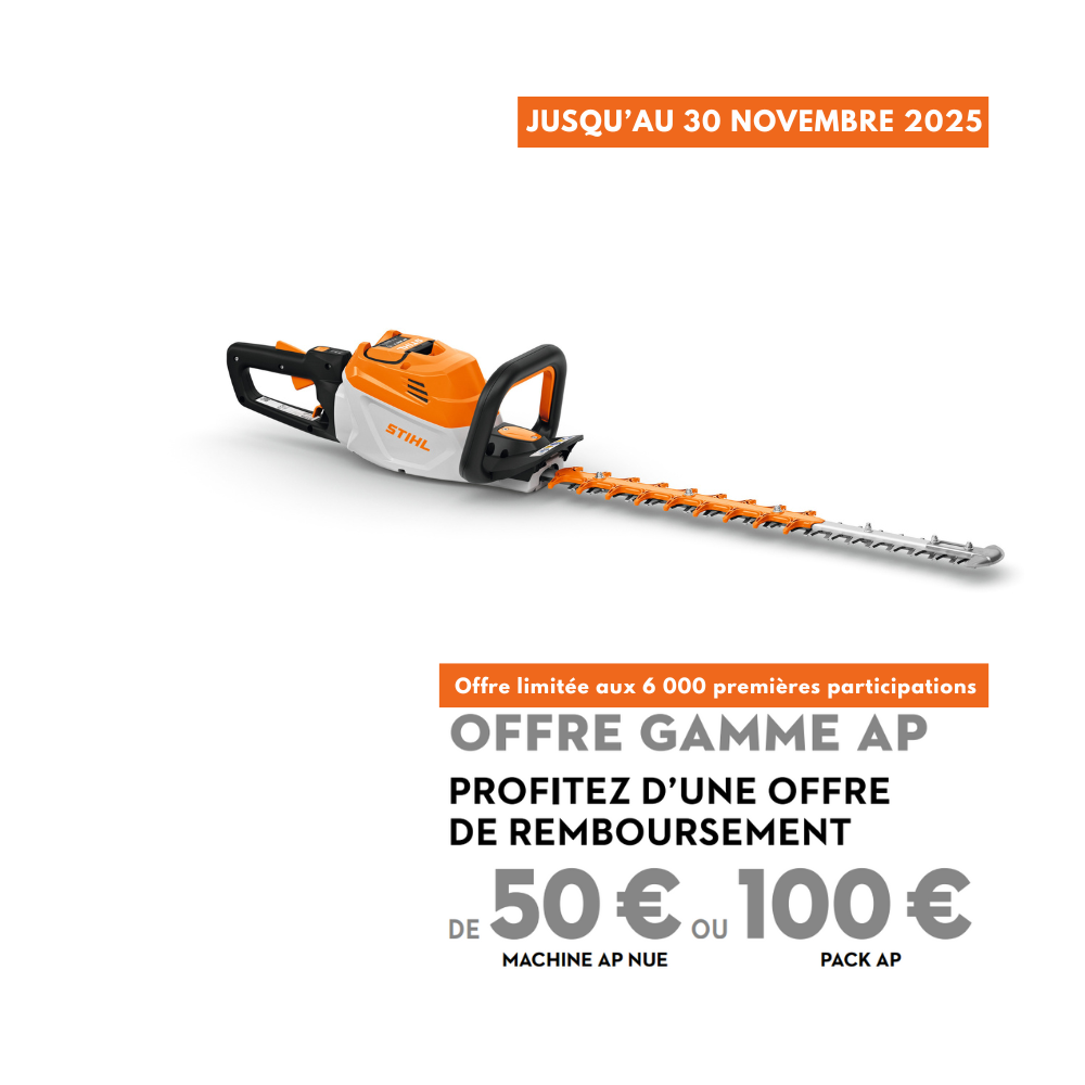 Sous réserve des stocks disponibles. Cette offre est accessible dans la limite des 6 000 premières participations reçues par STIHL. Modalités complètes et participation sur : https://www.stihl-promo.fr/
