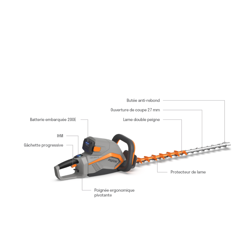 Le taille-haies à batterie embarquée HELION ESSENTIAL, de la GAMME ESSENTIAL PELLENC, est conçu pour offrir robustesse et efficacité pour des travaux de rabattage et de finition. Puissant, son lamier de 64 cm est équipé de dents à double tranchant pour les coupes précises. Il est aussi équipé d’une poignée ergonomique pivotante, d’une butée de protection et d’une protection anti-coupures vissée. Son IHM avec écran LED affiche le pourcentage de la batterie restante et permet la sélection des vitesses de coupe réglables sur trois niveaux. L’HELION ESSENTIAL est le choix incontournable pour les professionnels exigeants à la recherche d'un outil fiable et accessible.