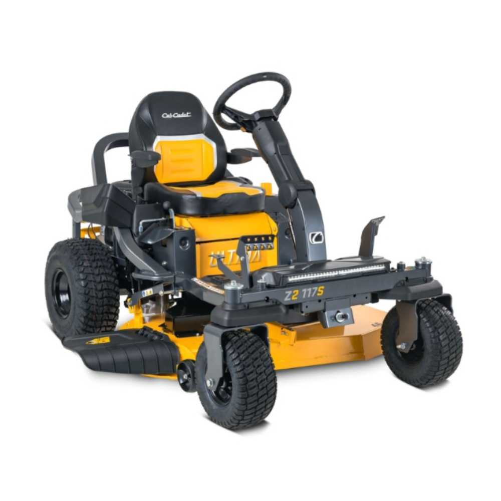La Z2 117S Ultima affiche des dimensions d’environ 203 x 155 x 114 cm (L x l x H), ce qui lui permet de rester maniable tout en offrant un important rendement de coupe. Son architecture de tracteur frontal à rayon de braquage zéro facilite le travail autour des arbres, parterres et obstacles sans reprise ni recoupe au coupe-bordures. Cette capacité, combinée à la largeur de coupe de 117 cm, en fait une machine particulièrement adaptée aux grandes pelouses jusqu’à 10 500 m².