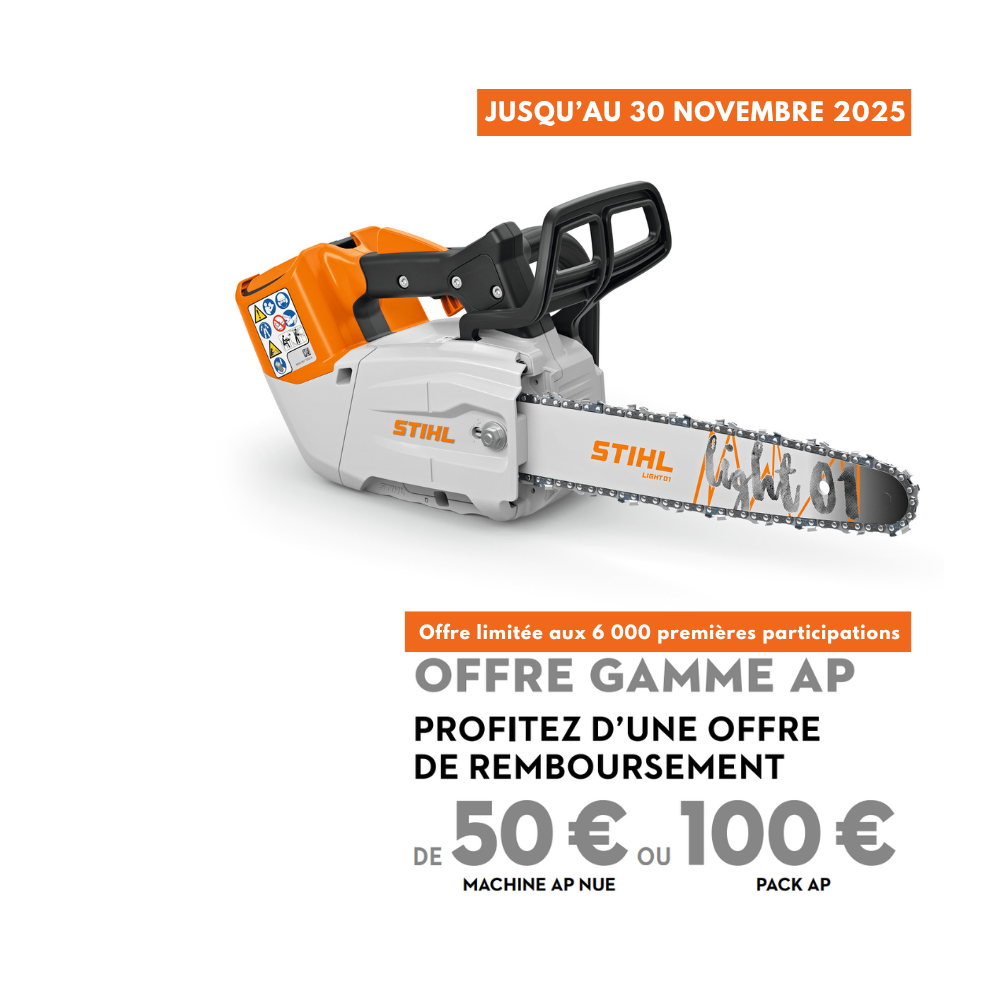 Sous réserve des stocks disponibles. Cette offre est accessible dans la limite des 6 000 premières participations reçues par STIHL. Modalités complètes et participation sur : https://www.stihl-promo.fr/